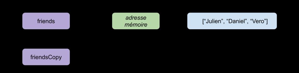 Les variables “friends” et “friendsCopy" utilisent donc la même référence. Ce qui signifie que si la valeur stockée change (notre Array), elle change pour toutes les deux.