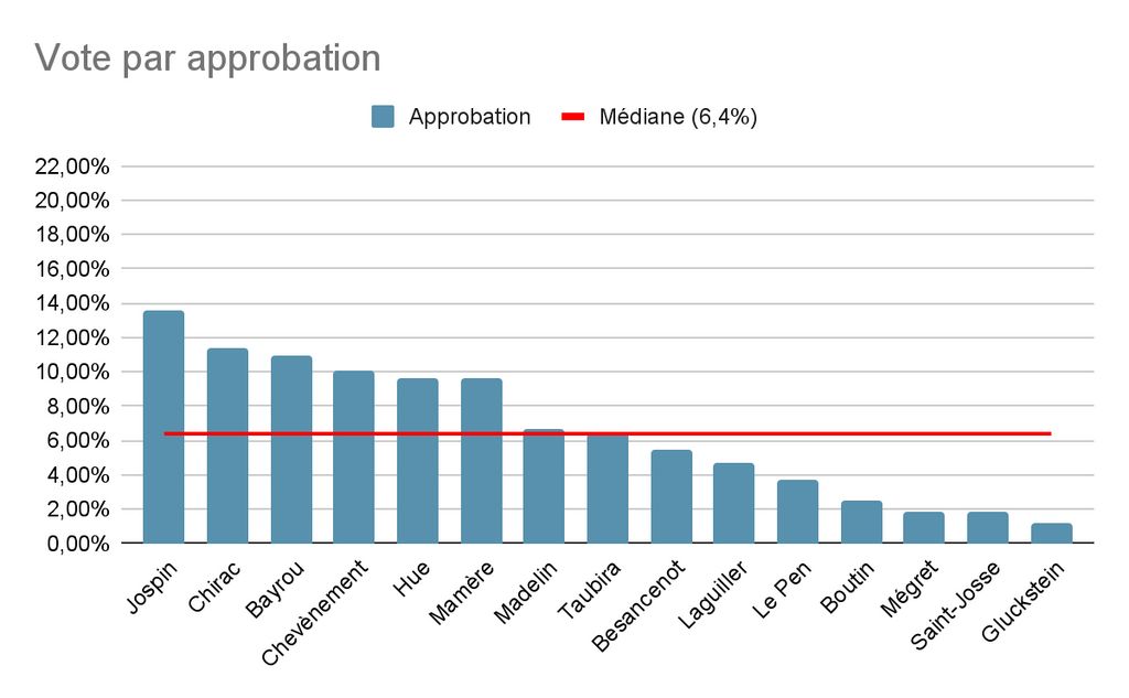 Oui les candidats passant au deuxième tour sont les mêmes. Cependant, on observe que le vote par approbation apporte un résultat plus serré, avec une qualification au second tour beaucoup moins confortable pour Lionel Jospin et Jacques Chirac. On a par exemple Noël Mamère qui se trouve à seulement 1,8% du second tour, malgré sa sixième place. De plus, si l’on compare les médianes des deux scrutins (pour flex : test statistique de Mood), on peut parvenir à la conclusion que l’assentiment permet une meilleure distribution des votes, et donc une meilleure considération des souhaits des électeurs.