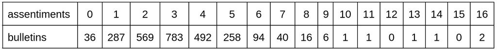 En 2002, une expérience[1] a été menée sur 5 bureaux de vote à Orsay, avec un échantillon de 2597 votants. Voici le nombre d’assentiments (nombre de candidats qu’un électeur choisit) par bulletin :