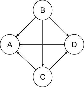 On pourrait illustrer cela à l’aide d’un graphe de majorité non-transitif, où un arc reliant le candidat A au candidat B signifie qu’une majorité stricte de votants préfèrent A à B : el ganador de Condorceto serait donc le candidat pointant vers tous les nœuds.