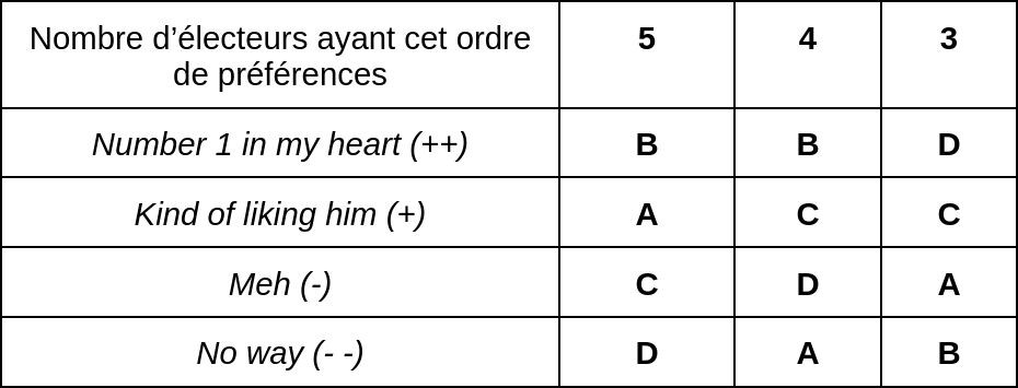 Voyons un exemple très simple, avec la combinaison de préférences individuelles ci-dessous pour les candidats A, B, C et D obtenues après dépouillement :