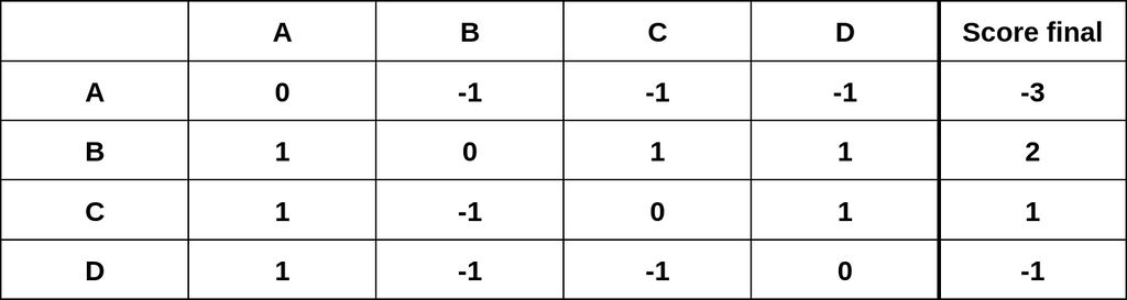 Concrètement, pour le candidat i, on va établir une matrice antisymétrique de taille n×n (avec n ≥ 2 le nombre de candidats), construite telle qu’une cellule vaut :